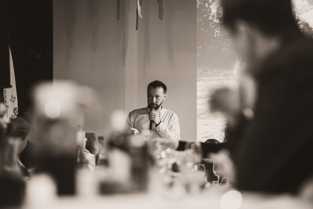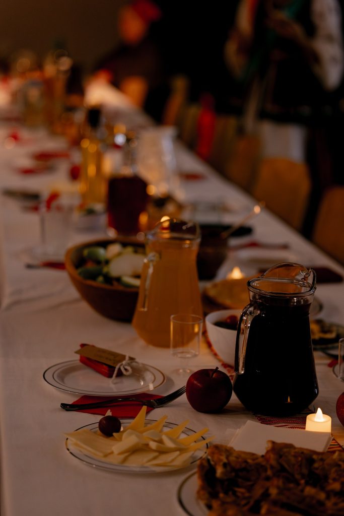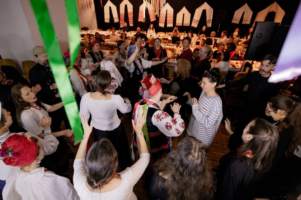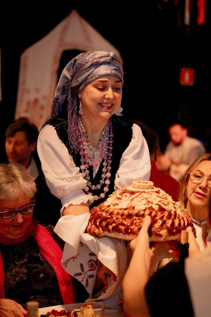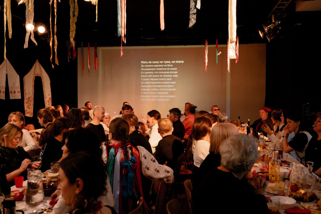 Приглушенный свет. На одной стене — рушники, на другой — сменяющиеся кадры с легендарными жителями Завгороднего. Столы, расставленные перевернутой буквой Ш, за ними сидят разные люди: знакомые и незнакомые, погруженные в фольклор и те, кто только открывает эту сокровищницу, юные и опытные, музыканты и поющие редко. На столах много еды — обычной, домашней: бутерброды, картошка с маслом, пироги с мясом, блины, салаты… Блюда передают от человека к человеку и всегда предлагают положить побольше. Но начинается всё с каравая. Как полагается, с солью. Это первый объединяющий элемент застолья: разламывая хлеб, мы перестаем быть друг другу чужими.