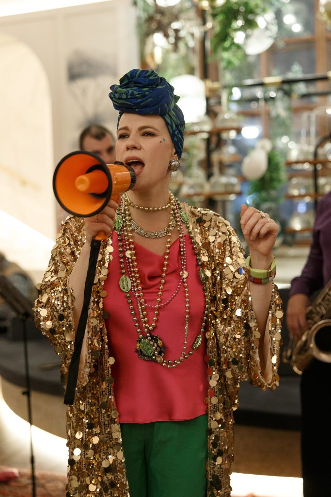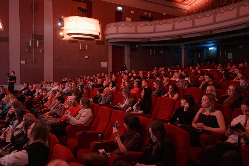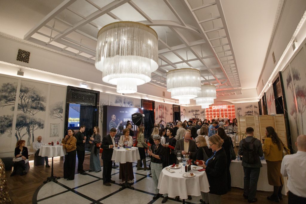 В фойе кинотеатра было слишком много звуков, сложно сфокусироваться на чём-то одном. Музыканты играли джаз. Чтобы певицу было хоть немного слышно, она использовала мегафон. Фотографы и операторы объективами ловили приглашенных артистов, а гости угощались закусками, игристым и обсуждали происходящее вокруг.
