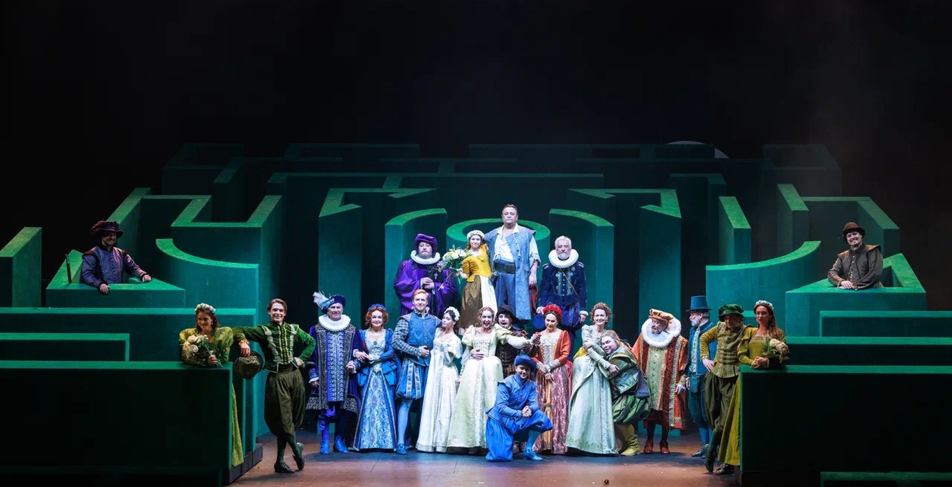 Зато удивили и порадовали оформлением. Художник Максим Обрезков выстроил на сцене конструкцию в виде огромного зеленого лабиринта (тоже символ Англии). По его тропинкам гуляют герои спектакля; оттуда же они частенько и ведут общение со зрителем. Находка действительно оригинальная и очень креативная. Для того, чтобы аудитория понимала, где конкретно разворачивается действие, над лабиринтом свисают то вывеска таверны, в которой прохлаждается Фальстаф, то гербы родов Форд и Пейдж. «Вырастают» в нем и зеленые деревца, изображающие парковую местность, и огромные розы.