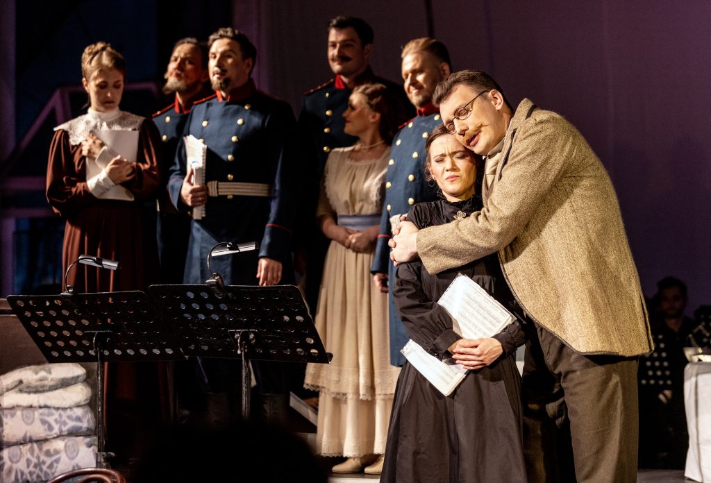 Артисты исполняли партии по нотам — решение, продиктованное насыщенным премьерным графиком театра. Умелое маневрирование певцов между пюпитрами выглядело эффектно в особо драматичные моменты. При этом спектакль далек от формата концертного исполнения — актерская игра, выстроенная под чутким руководством Георгия Исаакяна, была наполнена внутренним напряжением, точностью и глубиной. Получился искренний, живой театральный опыт, в котором техническая простота обернулась художественным достоинством.
