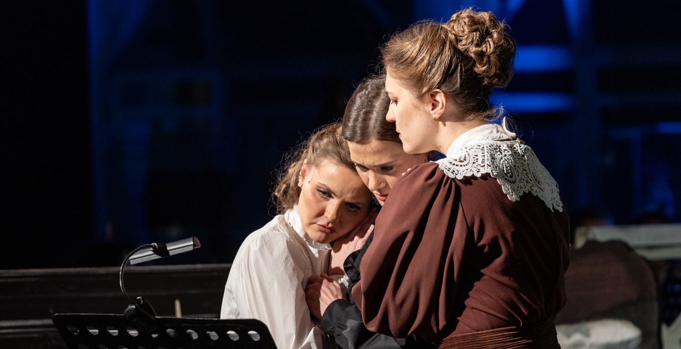 В центре спектакля — три главные героини, три сестры, каждая из которых обрела на сцене неповторимое звучание и облик. Юлия Макарьянц (Ольга) показала внутренне напряженную силу своей героини, собранность и чувство груза ответственности за семью; ее исполнение отличалось строгостью и вместе с тем мягкостью интонаций любящей старшей сестры, очень хорошо прозвучали «низы». Полина Севастьянова (Маша) убедительно передала горькую иронию и скрытую страсть женщины, жаждущей любви; голос звучал сдержанно, но насыщенно — осанисто и статно. Ее, на первый взгляд, холодный тембр, по мере продвижения сюжета «оттаивает» и раскрывается манящими страстными оттенками. Особенно хочется выделить Анну Малькину в роли Ирины. У нее очень красивый тембр — удивительно чистый, светлый, с той редкой блестящей окраской, которая сразу цепляет и запоминается. В сочетании с внешностью — хрупкой, почти фарфоровой — образ героини становится символом утраченной мечты и наивной веры в перемены.